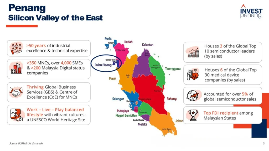 Penang hosts over 350 multinational corporations and 4,000 small and medium enterprises in the semiconductor and electronics sector. It is also Malaysia’s top IC design hub, with more than 30 design companies, the highest in the country.